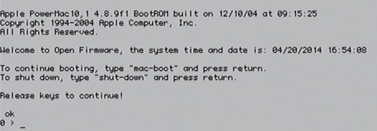 Reboot and – stay with me – hold down the following four keys: ⌘ (Command), Option/Alt, O and F. If you can do a Vulcan salute, you should manage that. Now you’ll see a white screen with a bit of text. No icons, no mouse pointer. This is the* Open Firmware* that was the equivalent of a PC’s BIOS on the Apple computers of this generation (Nerd Alert: and it’s a Forth!). Now enter* “eject-cd”, press return, and then “mac-boot”* to get back to your pinstriped OS X desktop.